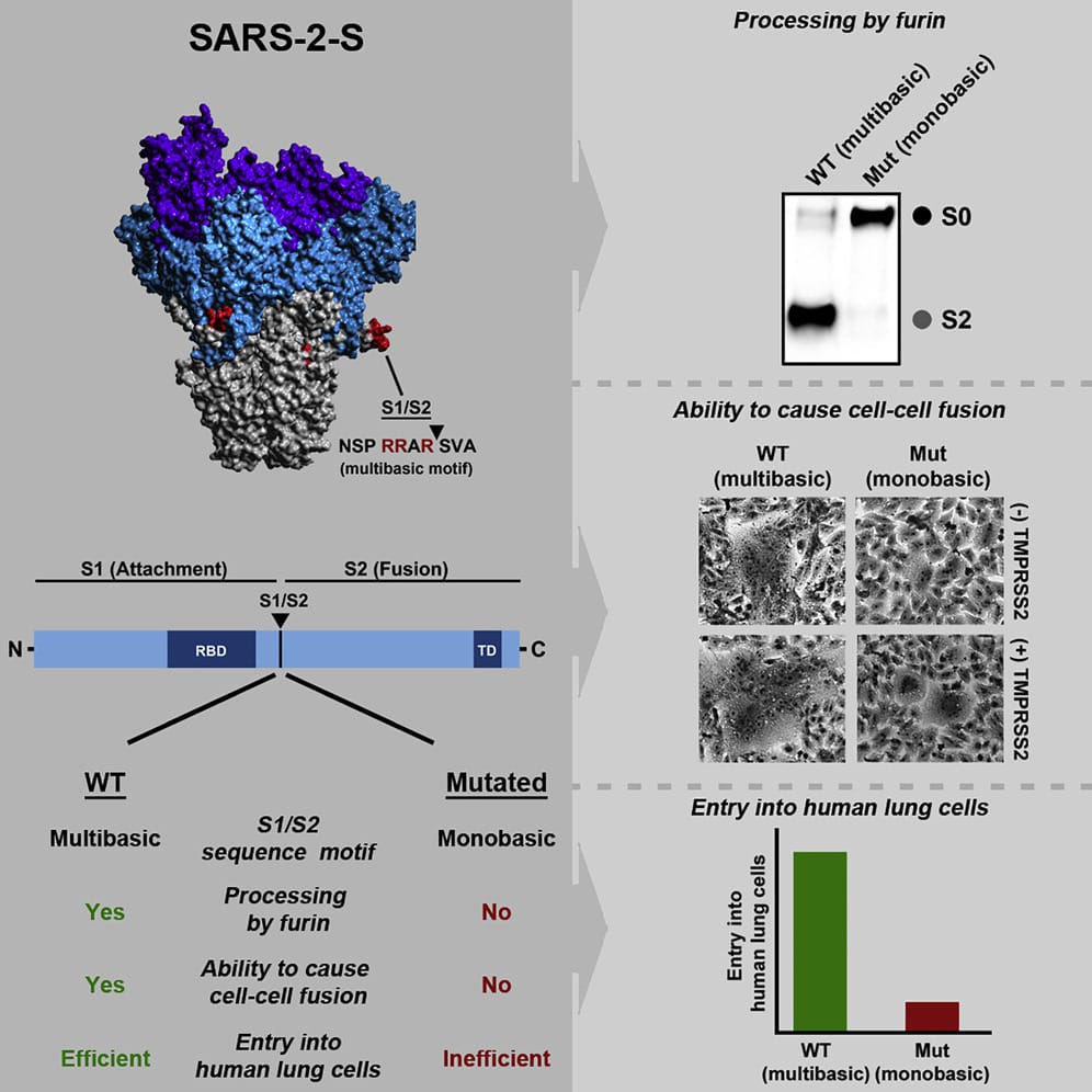 On May 1, 2020 a paper that contained information that could be used to disarm COVID–19 came out in Molecular Cell: "A Multibasic Cleavage Site in the Spike Protein of SARS-CoV-2 Is Essential for Infection of Human Lung Cells." This paper showed that the novel infection pathway used by the virus was necessary for efficiently infecting lung cells and for creating the abnormally fused cells ("syncytia") that were linked to higher clinical severity. It also demonstrated that modifying the spike protein could remove this feature by causing the virus to revert to a more traditional cell entry mechanism called endocytosis. Furthermore, it speculated that optimizing the spike protein, a process that could happen naturally, could lead to more severe variants.
